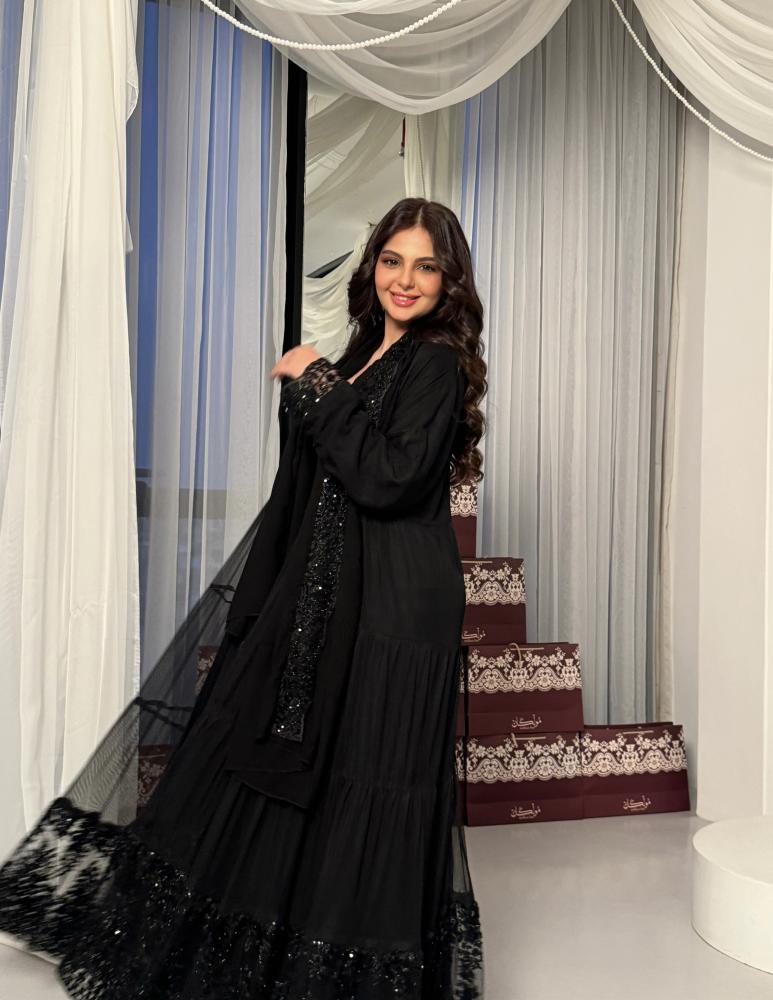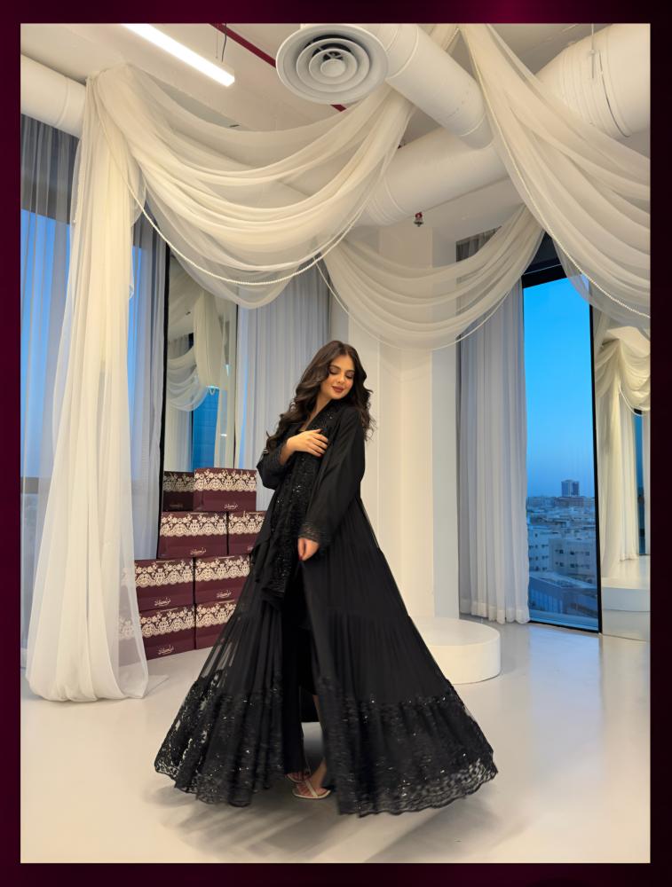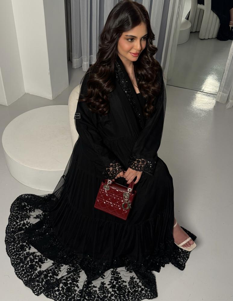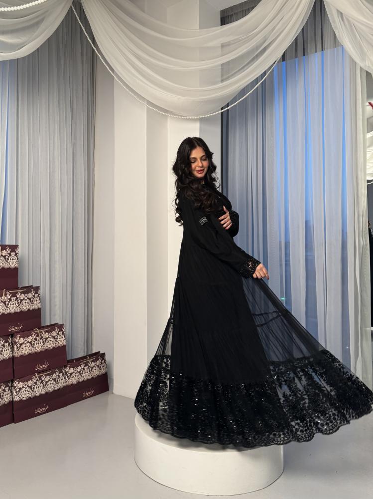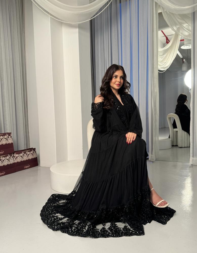 عباءة مصمّمة من تلّ مبطن بكريب يمنح انسيابية أنثوية فريدة، ومزيّنة بـ دانتيل فرنسي فاخر على الأطراف ليضيف لمسة من الرقيّ والترف.