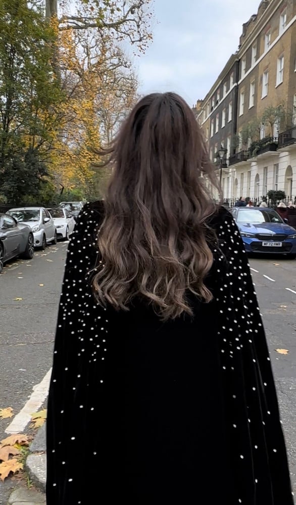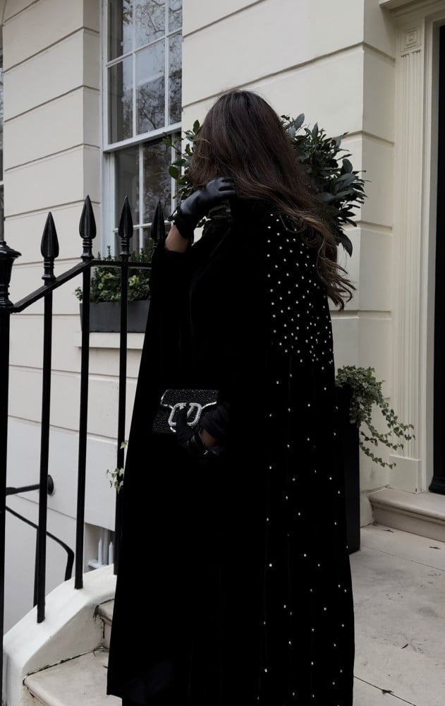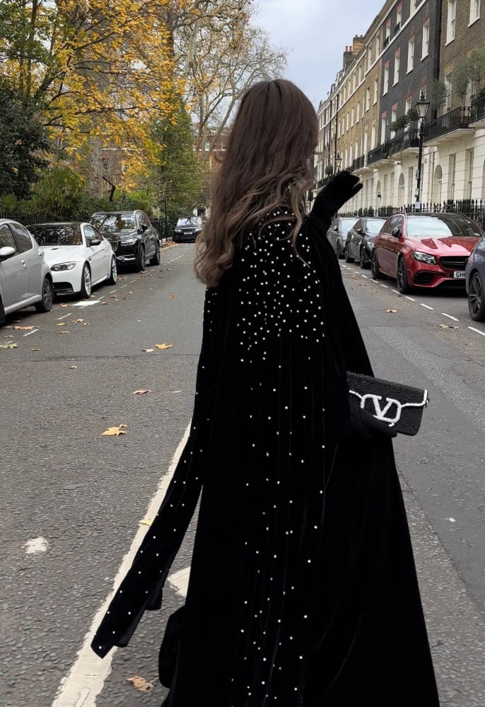 الكتف مضاف عليه قطعة قماش مخمل مزينه بشك يدوي كرستال
